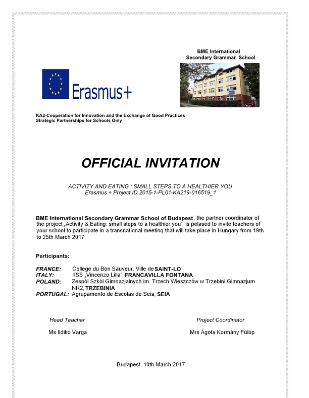 The aim of our European project, and BME International Secondary Grammar School is to convince teen students to improve the quality of life, change knowledge and behaviors related to physical activity and promote healthy dietary practices.